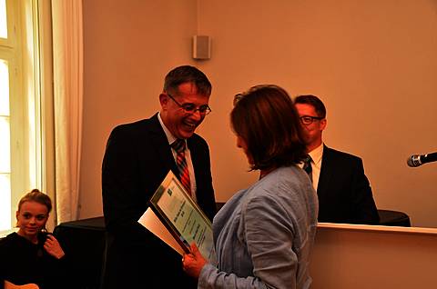 - Die Landrätin überreicht Axel Bold die Ehrenurkunde (Foto: Landkreis Merzig-Wadern)