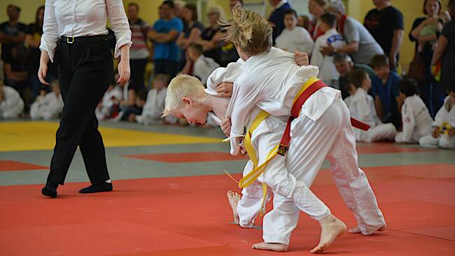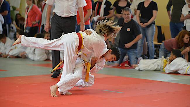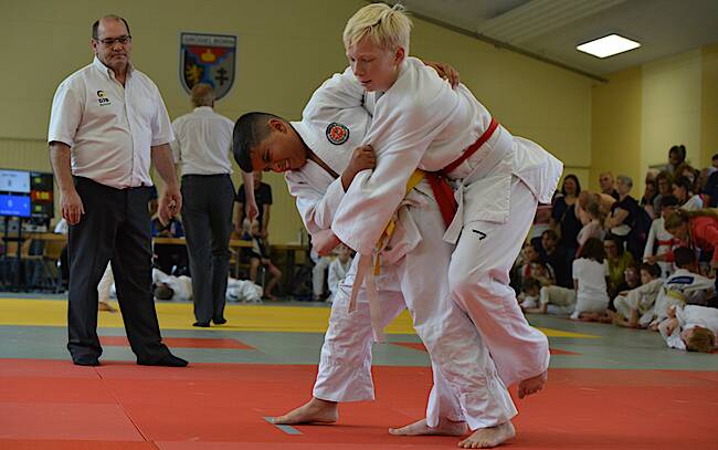 Die Jungs wurden im Anschluss gegen 12:00 Uhr gefordert. Die Luft in der kleinen Halle wurden zunehmend stickiger, was dem ein oder anderen auch ein bisschen Probleme bereitete. Das betrifft jedoch nicht die Gebrüder Othmann Diaaeddin und Tarek aus Syrien, die im Herbst des letzten Jahres mit dem Judo angefangen haben, mittlerweile den gelben Gürtel tragen und noch keinen einzigen Kampf verloren hatten. So war es auch diesmal. Während der jüngere Diaaeddin Othmann mit 3 Einzelsiegen die Klasse bis 22 Kilogramm beherrschte, war bis 29 Kilogramm Tarek Othmann mit 3 ungefährdeten Siegen nicht zu stoppen. Dabei siegte er auch gegen seinen Vereinskollegen Paul Bin, der stark und aufopferungsvoll kämpfte und mit ein bisschen Glück auch noch Zweiter werden können. Am Schluss immerhin Sieg im kleinen Finale um Platz 3.