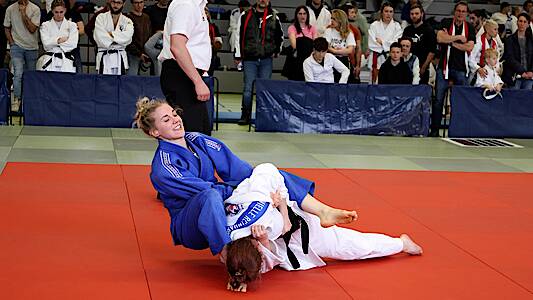 Jule Kleiber, blau versucht am Bode eine Hebeltechnik und holt später Silber bis 63 Kilogramm