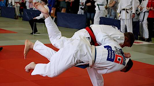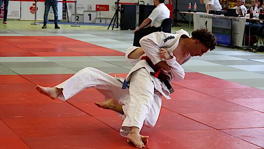 Max Weinand, roter Gürtel gewinnt das kleine Finale um Platz 3 bis 66 Kilogramm U18 gegen Maurice Giordano aus Homburg mit Hüftwurf Ushi Mata