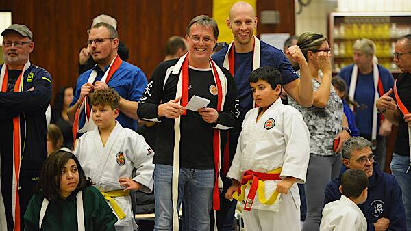 Über Silber freuten sich die Geschwister Albayosh Aysha bis 27 Kilogramm und Bruder Hamza bis 39 Kilogramm. Nach 2 Siegen in der Vorrunde, konnten beide erst im Finale gestoppt werden. Gleiches gilt für Nele Gaspers bis 43 Kilogramm, die sich ebenfalls, wie Eyad Albakkar, stark verbessert zeigte und Amira Aberkane bis 35 Kilogramm. Vorallem der extra aus Köln angereiste Großvater war stark beeindruckte von dem was er in Oberthal gesehen hatte. „Das hat mir gut gefallen. Die Stimmung hier, die viele Kämpfe der Kinder, alles, wie es scheint, sehr gut organisiert und natürlich auch meine Enkelin. Ich wusste gar nicht, dass sie so eine bärenstarke Kämpferin ist.“ lachte der offensichtlich beeindruckte Großvater von Amira.